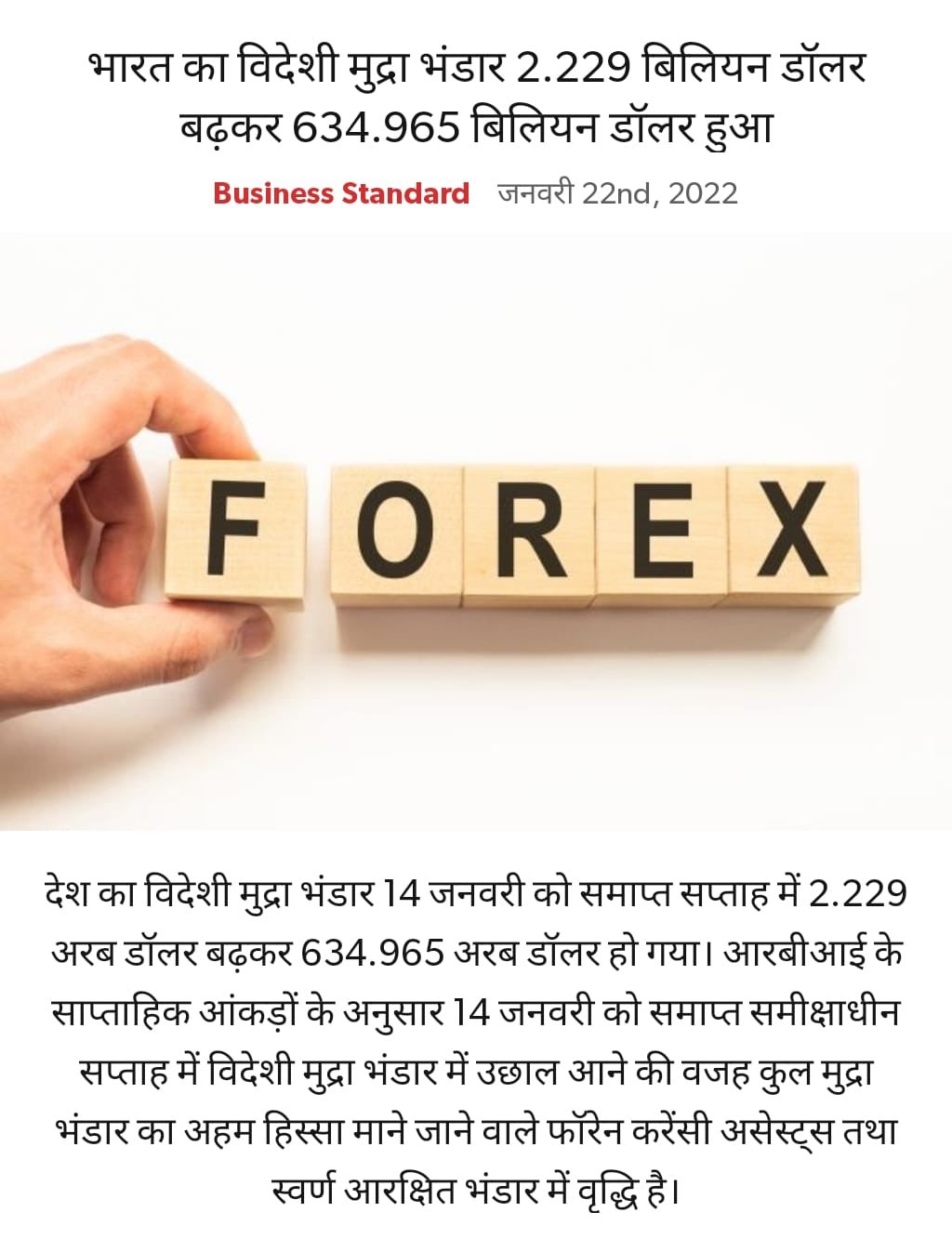 नई दिल्ली, 24जनवरी। देश का विदेशी मुद्रा भंडार 14 जनवरी को खत्म हुए हफ्ते में 2.229 अरब डॉलर बढ़कर 634.965 अरब डॉलर हो गया है. भारतीय रिजर्व बैंक के शुक्रवार को जारी आंकड़ों के मुताबिक, इससे पहले सात जनवरी को समाप्त सप्ताह में विदेशी मुद्रा भंडार 87.8 करोड़ डॉलर घटकर 632.736 अरब डॉलर हो गया था. जबकि तीन सितंबर, 2021 को खत्म हफ्ते में यह रिकॉर्ड 642.453 के उच्च स्तर पर पहुंच गया था.