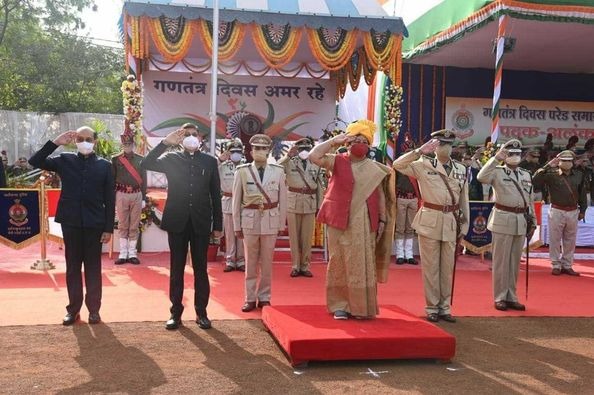 रायपुर, 26 जनवरी। छत्तीसगढ़ की राज्यपाल सुश्री अनुसुईया उइके ने आज छत्तीसगढ़ की राजधानी रायपुर के पुलिस परेड ग्राउंड में 73 वें गणतंत्र दिवस के अवसर आयोजित मुख्य समारोह में ध्वजारोहण किया। इस अवसर पर राज्यपाल ने प्रदेशवासियों को गणतंत्र दिवस की शुभकामनाएं दी। साथ ही राष्ट्रीय ध्वज एवं राज्यपाल को गार्ड ऑफ ऑनर दिया गया। सुश्री उइके ने आसमान में तिरंगे के गुब्बारे भी छोड़े। इस अवसर पर मुख्य सचिव श्री अमिताभ जैन और डीजीपी श्री अशोक जुनेजा उपस्थित थे।