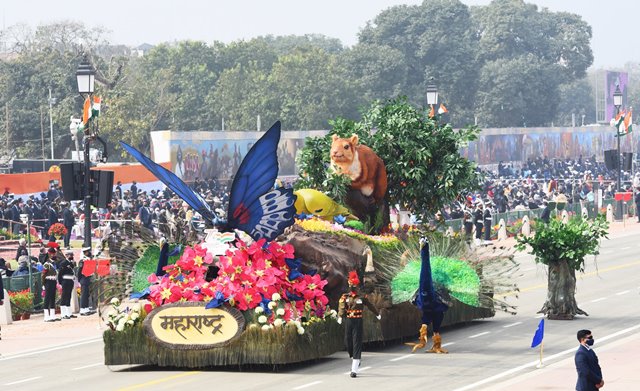 झांकी के अगले भाग में ब्लू मॉरमॉन नाम की तितली की आठ फुट ऊंची तथा छह फुट चौड़ी पंखों वाली झांकी ने उपस्थित लोगों का ध्यान आकर्षित किया. इस झांकी पर राज्य फूल ‘तम्हन’ नामक राज्य पुल का रंगीन गुलदस्ता भी दर्शाया गया. इन फूलों पर छोटी-छोटी आकर्षक तितलियों की प्रतिकृति भी दर्शकों को खूब भाई और इसे काफी सराहा गया. इस झांकी पर बड़े आकार में राज्य प्राणी ‘शेकरू’ के साथ ही यूनेस्को की सूची में समाहित कास पठार दर्शाया गया. इस पठार पर पाई जाने वाली सभी जैव विविधता को भी प्रस्तुत किया गया. हरियाल पक्षी की प्रतिकृति, झांकी के पिछले भाग में पेड़ की डाली पर बैठे हुए राज्य प्राणी शेकरू की प्रतिकृति और राज्य पेड़ ‘आम’ की प्रतिकृति ने भी उपस्थिति का ध्यान आकर्षित किया. साथ ही (बस्टर्ड) मलधोक पक्षी, केकड़े, मछली, बाघ, अंबोली झरना, राजहंस गिद्ध, उल्लू की प्रतिकृतियों को भी दर्शकों ने काफी सराहा.