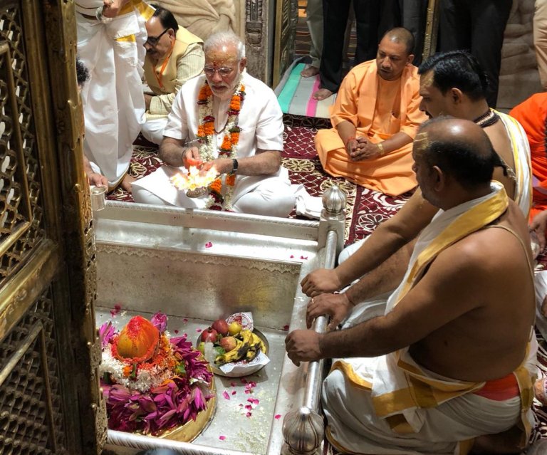 वाराणसी, 1 मार्च। प्रधानमंत्री नरेंद्र मोदी अपने संसदीय क्षेत्र वाराणसी में काशी विश्वनाथ मंदिर में हाजिरी लगाई। इस दौरान वैदिक परंपराओं और रीतियों के अनुरूप आचार्यों के निर्देशन में पीएम ने बाबा का पूजन अर्चन किया और चुनाव में जीत की कामना कर मंदिर परिसर से एयरपोर्ट की ओर रवाना हो गए। पीएम मोदी ने काशी विश्वनाथ मंदिर में हाजिरी लगाने से पहले काशी के लोगों को प्रणाम कर संबोधन शुरू किया।