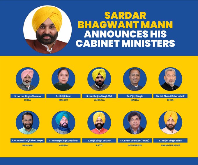 पंजाब में मुख्यमंत्री भगवंत मान के नेतृत्व वाली आम आदमी पार्टी ने शुक्रवार को 10 कैबिनेट मंत्रियों के नाम पर अंतिम मुहर लगा दी है. इन नामों में खास बात ये है कि राज्य में शानदार जीत दर्ज करने वाली आम आदमी पार्टी ने बड़े-बड़े विजेताओं को छोड़कर नए विधायकों को मौका देने पर ज्यादा ध्यान दिया है और इतना ही नहीं पहली सूची में मंत्री चुनने में पार्टी ने दूसरी बार के विधायकों को भी नजरअंदाज किया है। ये सभी विधायक आज चंडीगढ़ में मंत्री पद की शपथ लेंगे।