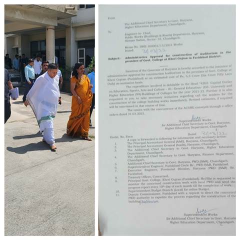 जिसके बाद विधायक नीरज शर्मा ने दिसंबर माह के विधानसभा सत्र में मांग रखी थी कि इस कॉलेज में ऑडिटोरियम बनवाया जाए और लैपटॉप उपलब्ध करवाए थे क्योंकि यह मांग कॉलेज प्रबंधन द्वारा विधायक नीरज शर्मा से की गई थी इसी को देखते हुए अब सरकार द्वारा खेड़ी कॉलेज में ऑडिटोरियम निर्माण के लिए लोक निर्माण विभाग को 6 करोड़ पचास लाख की अनुमति जारी कर दी है जल्द ही लोक निर्माण विभाग इसका कार्य शुरू करवाएगा। इस ऑडिटोरियम के बनने से हजारों छात्रों को इसका फायदा होगा। क्योंकि इस कॉलेज में एनआईटी विधानसभा के नहीं फरीदाबाद के अन्य विधानसभाओं के बच्चे भी पढ़ते हैं। इसके साथ ही कॉलेज प्रबंधन ने अपनी कुछ मांगे विधायक नीरज शर्मा के सामने रखी इसमें एमकॉम का नया कोर्स शुरू करवाने के लिए, प्लेग्राउंड जर्जर हालत में पड़ा है उसको डेवलप करवाने, महिला छात्रों के लिए बस की सुविधा शुरू कराने के लिए अनुरोध गया जिस पर विधायक श्री नीरज शर्मा द्वारा मौके पर ही सचिव ट्रांसपोर्ट विभाग से बात कर जल्द से जल्द बस सुविधा शुरू कराने बारे निर्देश दिए गए हैं। इसके अलावा नए टीचिंग ब्लॉक की अनुमति आ गई है लेकिन पैसा अभी तक नहीं आया उसको जल्द से जल्द जारी करवाने बारे अनुरोध किया गया। राजकीय महाविद्यालय खेड़ी गुजरान की प्रिंसिपल श्रीमती कृष्णा शेरॉन, एसोसिएट प्रोफेसर सुनील शर्मा, एसोसिएट प्रोफेसर तनुश्री दहिया, पूर्व छात्र संगठन के नेता पवन भाटी जी द्वारा सभी साथियों के साथ फूल मालाओं से स्वागत किया गया।