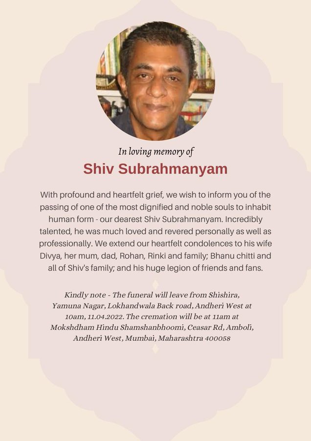 मुंबई, 11अप्रैल। पॉपुलर एक्टर और स्क्रीन राइटर शिव कुमार सुब्रमण्यम के निधन की खबर ने एक बार फिर फिल्म इंडस्ट्री को बड़ा सदमा दिया है। कई फिल्मों और टीवी सीरीज में अपनी दमदार एक्टिंग का लोहा मनवा चुके अभिनेता शिव कुमार के निधन से फैंस में भी शोक की लहर दौड़ पड़ी है। एक्टर के निधन की जानकारी फिल्म निर्देशक हंसल मेहता ने ट्वीट कर दी। उन्होंने शिव कुमार के प्रति अपनी श्रद्धांजलि भी अर्पित की है।
