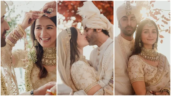 मुंबई, 15 अप्रैल। रणबीर कपूर और आलिया भट्ट आधिकारिक तौर पर पति-पत्नी बन गये है। दोनों ने परिवारवालों और करीबियों की मौजूदगी में सात फेरे लिये। ये कपल पिछले 5 सालों से एकदूसरे को डेट कर रहे थे। अब दोनों हमेशा के लिए एकदूजे के हो गये हैं। अपने जीवन के प्यार के साथ शादी के बंधन में बंधने के बाद, आलिया भट्ट ने अपने इंस्टाग्राम हैंडल की प्रोफाइल तस्वीर बदल दी। उन्होंने रणबीर कपूर के साथ अपनी शादी से एक ड्रीमी फोटो डाली। फोटो में आलिया और रणबीर रॉयल लग रहे थे। अपनी शादी के लिए, आलिया और रणबीर ने सब्यसाची के खूबसूरत आउटफिट में ट्विन किया। आलिया भट्ट ने मेनस्ट्रीम लहंगा छोड़ दिया और हाथ से रंगी आइवरी ऑर्गेना साड़ी पहनी। रणबीर ने मीडिया को पोज देते हुए आलिया को गोद में उठा लिया। उन्हें ऐसा करता देख आलिया शर्म से लाल हो गईं। रणबीर कपूर और आलिया भट्ट की पहली झलक सामने आ गई है। जिसमें दोनों फोटो खिंचवाते नजर आ रहे हैं।