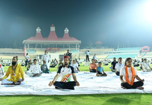 नई दिल्ली, 15मई। 21 जून को होने वाले अंतर्राष्ट्रीय योग दिवस के उपलक्ष्य में केंद्रीय युवा मामले और खेल मंत्री श्री अनुराग सिंह के नेतृत्व में युवा मामले और खेल मंत्रालय द्वारा शनिवार को धर्मशाला और नई दिल्ली में एक साथ योग महोत्सव की एक अनूठी शाम का आयोजन किया गया। इस अवसर पर श्री अनुराग ठाकुर ने धर्मशाला स्टेडियम से 40 मिनट के योग प्रोटोकॉल का नेतृत्व किया, जिसमें 2000 से अधिक एथलीटों और योग चिकित्सकों ने भाग लिया।