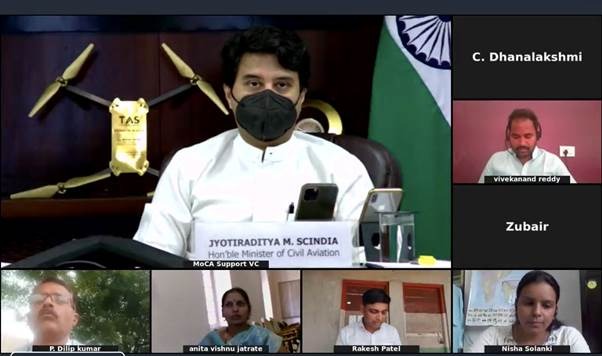 नई दिल्ली, 18 मई। नागरिक उड्डयन मंत्री ज्योतिरादित्य एम सिंधिया ने मंगलवार को किसान ड्रोन के लाभों और चुनौतियों पर देश भर के विभिन्न किसानों के साथ बातचीत की।