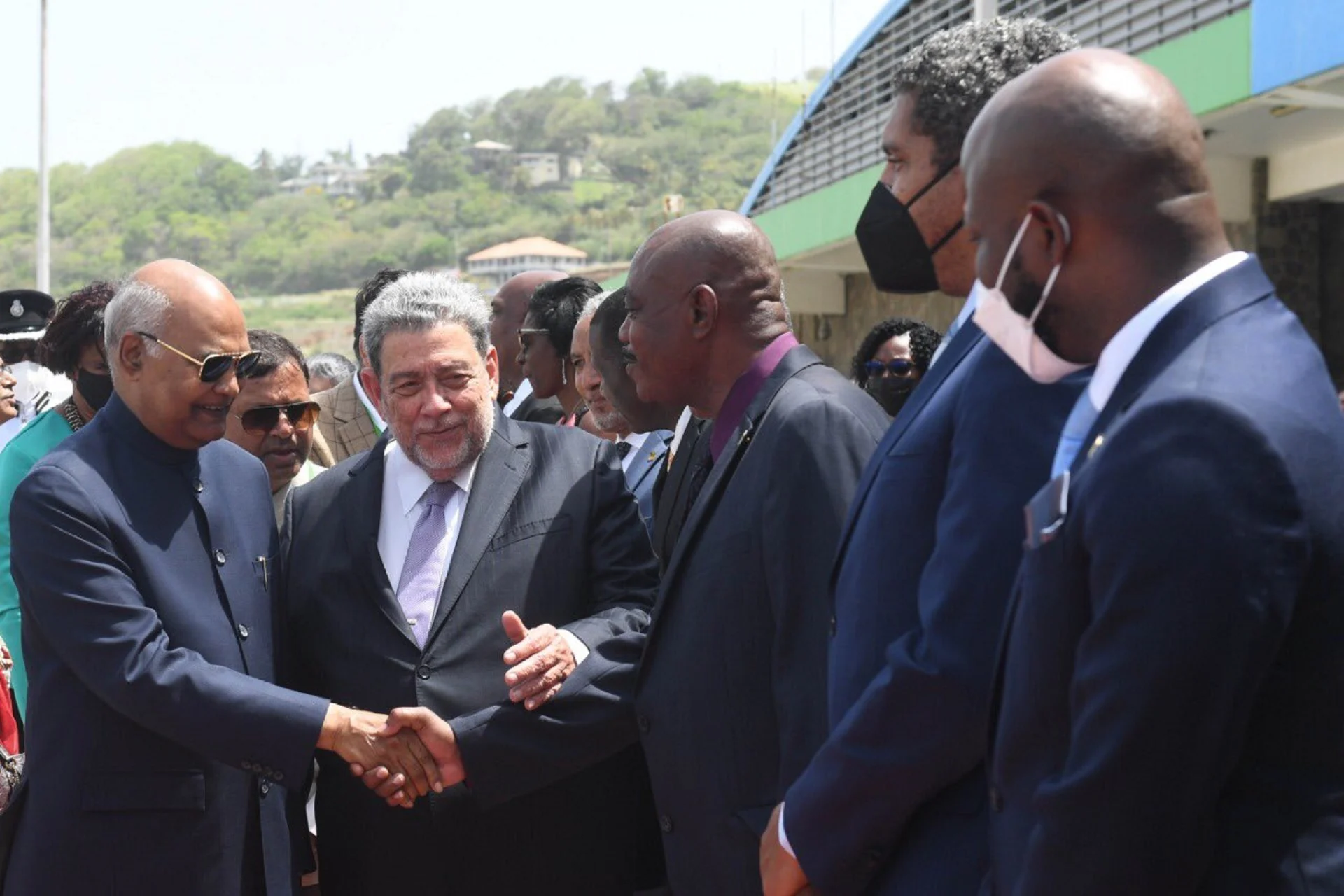 किंग्सटाउन, 20मई। राष्ट्रपति जमैका और सेंट विनसेंट व ग्रेनाडीन्स, दो राष्ट्रों के अपने राजकीय दौरे के अंतिम चरण में 18 मई, 2022 को सेंट विनसेंट व ग्रेनाडीन्स की राजधानी किंग्सटाउन पहुंच गये है। किसी भी भारतीय राष्ट्रपति की यह इस देश की पहली यात्रा है। सेंट विनसेंट व ग्रेनाडीन्स की गवर्नर जनरल महामहिम सुश्री डेम सूजन डूगन, प्रधानमंत्री डॉ. राल्फ ई. गोनजाल्विस और अन्य गणमान्यों ने अरगाइल इंटरनेशनल एयरपोर्ट पर राष्ट्रपति की अगवानी की। हवाई अड्डे पर उतरने के बाद राष्ट्रपति को सलामी गारद पेश की गई।