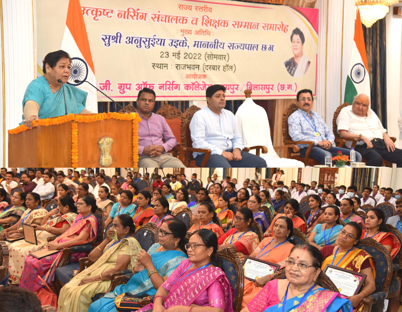 रायपुर, 24मई। राज्यपाल अनुसुईया उइके छत्तीसगढ़ राजभवन में आयोजित ‘‘उत्कृष्ट नर्सिंग शिक्षक सम्मान कार्यक्रम‘‘ में बतौर मुख्य अतिथि शामिल हुईं। आज इस अवसर पर आयोजित कार्यक्रम में 55 नर्सिंग शिक्षकों और 130 नर्सिंग कॉलेज संचालकों को सम्मानित किया गया। छत्तीसगढ़ ग्रुप ऑफ नर्सिंग रायपुर-बिलासपुर के द्वारा आयोजित इस कार्यक्रम में नगर निगम रायपुर के महापौर श्री एजाज ढेबर, स्वास्थ्य विभाग के सचिव डॉ. सी. आर. प्रसन्ना, वरिष्ठ शिक्षाविद् श्री आई. पी. मिश्रा, छत्तीसगढ़ ग्रुप ऑफ नर्सिंग रायपुर के अध्यक्ष श्री नवीन बागरेचा उपस्थित थे।
