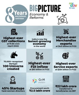With the mantra of reform, perform and transform as the mantra, India has been able to remain one of the fastest economies in the world. Here's a 🧵 about how the government is ushering in growth and economic prosperity. #8YearsofReforms pic.twitter.com/73oKPbtihJ