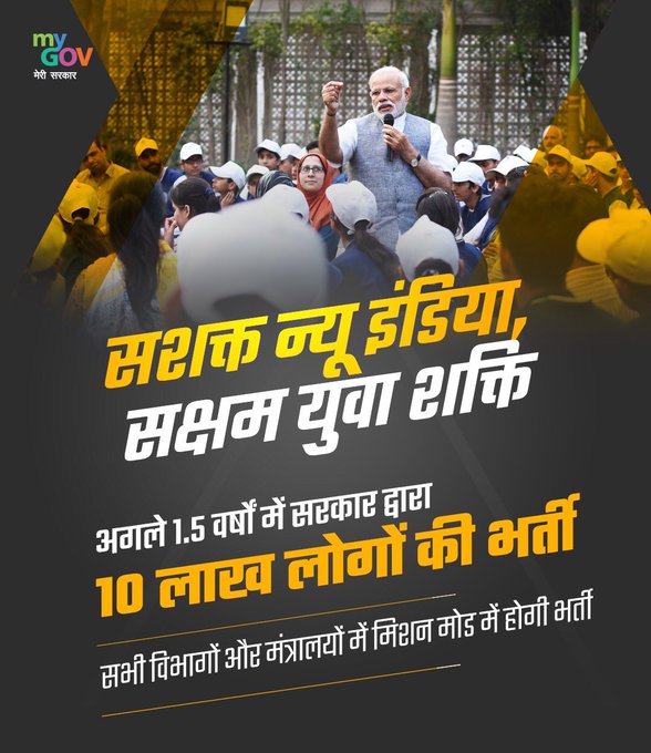 मोदी जी द्वारा सभी सरकारी विभागों व मंत्रालयों में 1.5 साल में मिशन मोड में 10 लाख भर्ती करने का निर्देश युवाओं में नयी आशा और विश्वास लायेगा।
