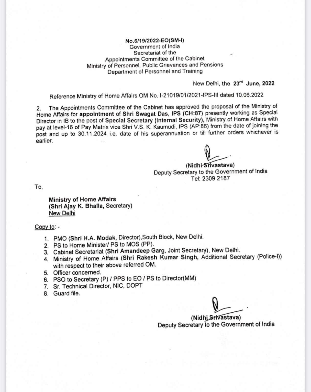 नई दिल्ली, 24 जून। IPS अधिकारी स्वागत दास को गृह मंत्रालय में विशेष सचिव (आंतरिक सुरक्षा) के रूप में नियुक्त किया गया है।