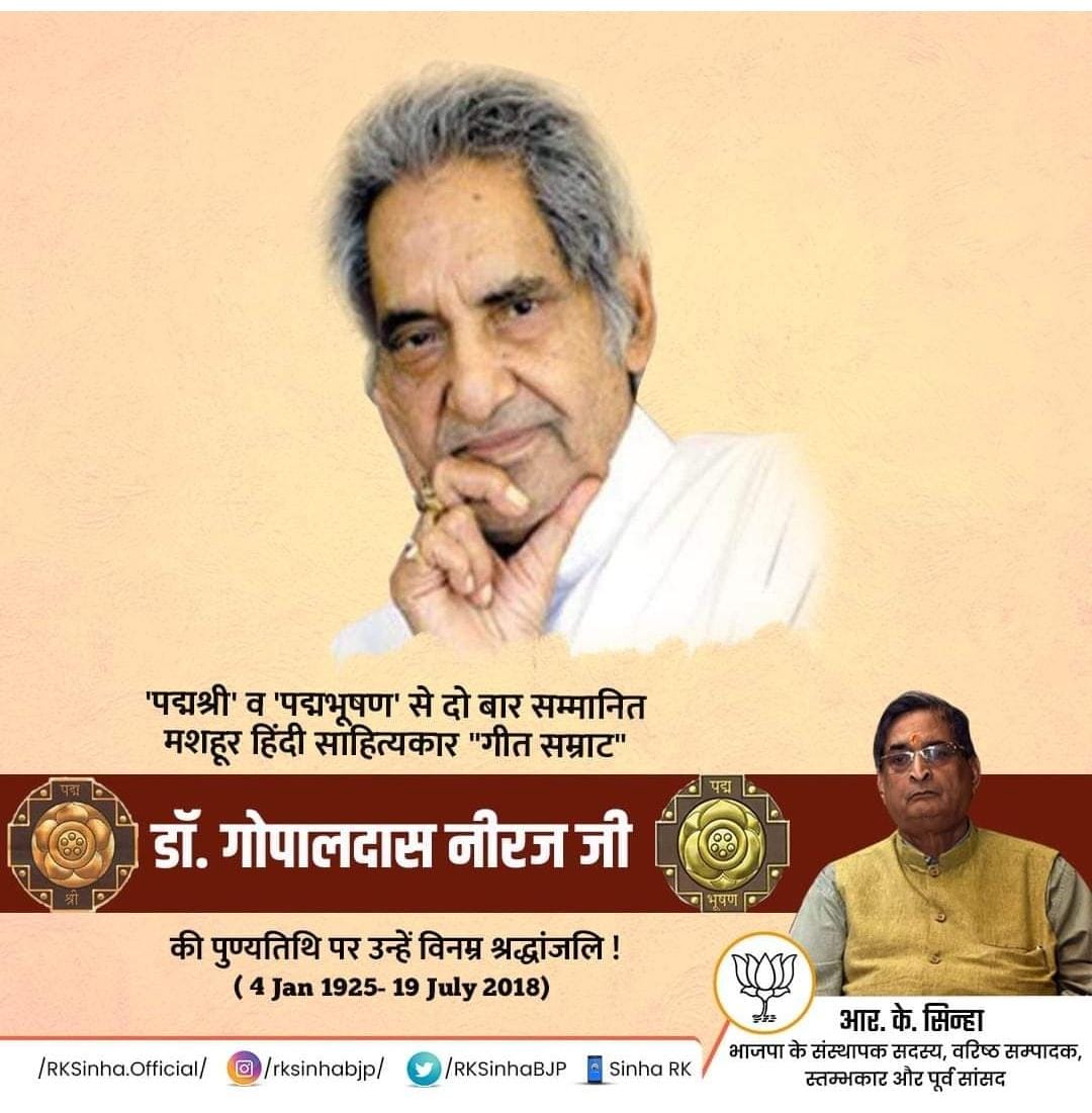 ‘पद्मश्री’ व ‘पद्मभूषण’ से दो बार सम्मानित मशहूर हिंदी साहित्यकार यशकाय शेष गीत सम्राट डॉ गोपालदासनीरज’ जी की पुण्यतिथि पर उन्हें विनम्र श्रद्धांजलि अर्पित करता हूँ ! गोपालदास सक्सेना ‘नीरज’ का जन्म 4 जनवरी 1925 को उ.प्र. के इटावा जिले के ब्लॉक महेवा के निकट पुरावली गाँव में बाबू ब्रजकिशोर सक्सेना के यहाँ हुआ था।
