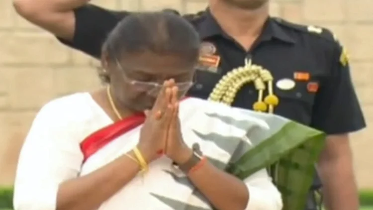 नई दिल्ली, 25 जुलाई। राष्ट्रपति-चुनाव द्रौपदी मुर्मू ने शपथ ग्रहण समारोह से पहले सोमवार सुबह राज घाट में महात्मा गांधी के स्मारक पर पुष्पांजलि अर्पित की।
