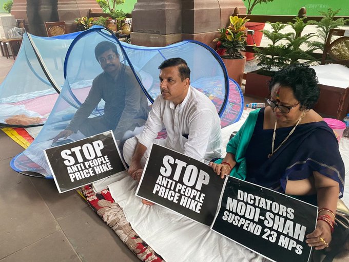 सांसदों का प्रदर्शन गुरुवार की रात भी जारी रहा और संसद भवन के बाहर के मच्छरों से परेशान सांसदों ने मच्छरदानी लगाकर कल की रात अपनी नींद पूरी की. एएनआई से जारी तस्वीर में आम आदमी पार्टी के निलंबित सांसद संजय सिंह मच्छरदानी में सोए हुए दिखाई दे रहे हैं. तो वहीं, टीएमसी सांसद डेरेक ओ ब्रायन, सुष्मिता देव और मौसम बेनजीर नूर भी उनके आसपास दिखाई दे रही हैं.