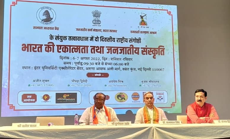 इस राष्ट्रीय संगोष्ठी में ऐसी ऐसी हस्तियॉं उपस्थित थी जिन्होंने गौरवपूर्ण ढंग से यह बताया कि भारत मे जितने भी जनजातीय समूह हैं वे सब हिन्दू हैं। ऐसे ही वक्ताओं में शामिल थे इस सत्र के अध्यक्ष राजस्थान प्रशासनिक सेवा के सेवानिवृत्त अपर कलेक्टर एवं वनवासी कल्याण आश्रम के अध्यक्ष श्री रामचन्द्र खराड़ी। उन्होंने कहा मैं भील हूँ, मैं हिन्दू हूँ। विदेशियों को जन जातीय लोगों का जो चित्र दिया गया वह विचित्र है। अपनी सेवाकाल की कुछ घटनाओं का उन्होंने जिक्र किया। यह सत्य है कि भारत का पूरा जनजातीय समाज हिन्दू है। अंग्रेजों ने व्यवस्थित तरीके से भारतीय समाज में भेदभाव का ज़हर इतना घोल दिया कि वनवासी भी भ्रमित होने लगे। जबकि सच्ची बात यह है कि वनवासी भारत के समाज और संस्कृति के संरक्षक हैं। इस दौर में ऐसे विषयों को प्रचारित किया जा रहा है जिससे वनवासी/जनजातीय वर्ग को हिंदुओं से अलग किया जाय। 9 अगस्त को मूल निवासी दिवस मनाने के पीछे भी समाज मे एक और दरार डालने का प्रयास है। उन्होंने कहा जिन लोगों ने औपनेशिक काल मे मूल निवासियों की हत्याएं की, उन्हें दरबदर किया वे अब मूल निवासी दिवस मॉन रहे हैं। श्री खराड़ी ने बताया कि दुनिया में जनजातीय लोगों की संख्या 43 करोड़ है। इनमे से 25 प्रतिशत लोग (लगभग साढ़े दस करोड़ लोग) भारत में निवास करते हैं। उन्होंने बताया भारत की सीमाओं पर, भारत के पर्वतीय व वन क्षेत्रों में निवास करनेवाले, नदियों के किनारे बसने वाले सभी जनजाति के लोग इसी धरती के हैं, कहीं इधर उधर से नही आये। ये सभी हिन्दू हैं। जिन्हें बांटने के बड़े प्रयास अंग्रेजों ने खूब किये। अंग्रेज़ी शासनकाल की जनगणना में भी जन जातिवर्ग को अलग दिखाया जाने लगा था। स्वतंत्र भारत में 1951 की जनगणना से उनका धर्म हिन्दू लिखा जाने लगा। इन वनवासियों को अनेक नामों से दुनिया भर में जाना जाता है। कुछ एक हैं- एबोरिजिनल, इंडिजिनियस, ट्राइब, स्वदेशी, वनवासी, आदिवासी, गिरिजन, मूल निवासी और जनजाति आदि। भारत मे 705 जनजातियां हैं। इनमे से कुछ के नाम हैं- कोल, भील, संथाल, मुंडा, सोरेन, हो, बैगा, सहरिया, पैंका, जुआंग, उरांव, भूमिज, मीणा, गरासिया आदि।