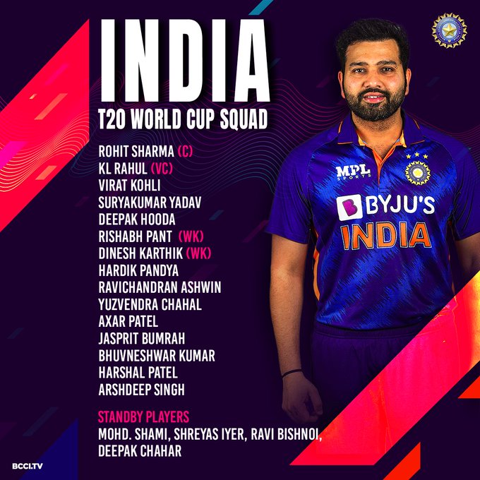 चयनकर्ताओं ने इस टीम में चार खिलाड़ियों को स्टैंडबाय के तौर पर रखा है, जिसमें सीनियर तेज गेंदबाज मोहम्मद शमी, श्रेयस अय्यर, रवि विश्नोई और दीपक चाहर का नाम शामिल है.