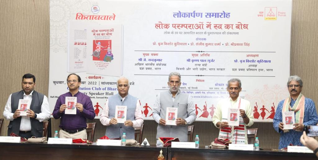दिनांक 14 सितंबर 2022 को नई दिल्ली स्थित कांस्टीट्यूशन क्लब में प्रज्ञा प्रवाह प्रतिष्ठान और किताबवाले प्रकाशन समूह की ओर से “लोक परम्पराओं में स्व का बोध ” पुस्तक का लोकार्पण समारोह आयोजित किया गया। पुस्तक का संपादन किया है, विद्वत त्रयी प्रोफेसर बृज किशोर कुठियाला, संवादगुरु, पूर्व कुलपति मा. ला. चतुर्वेदी पत्रकारिता और संचार विश्वविद्यालय, प्रोफेसर संजीव कुमार शर्मा, पूर्व कुलपति, महात्मा गांधी केंद्रीय विश्वविद्यालय और प्रोफेसर श्रीप्रकाश सिंह, दिल्ली विश्वविद्यालय के राजनीति विज्ञान विभाग में वरिष्ठ प्रोफेसर ने।