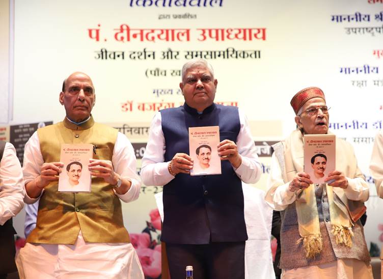 नई दिल्ली, 26सितंबर। उपराष्ट्रपति जगदीप धनखड़ ने शनिवार को नई दिल्ली में ‘पंडित दीनदयाल उपाध्याय – जीवन दर्शन और समसामयिकता’ (पांच खंड) पुस्तक का विमोचन किया। इस अवसर पर उन्होंने आज के समय में पंडित दीनदयाल के विचारों का महत्व समझाया।