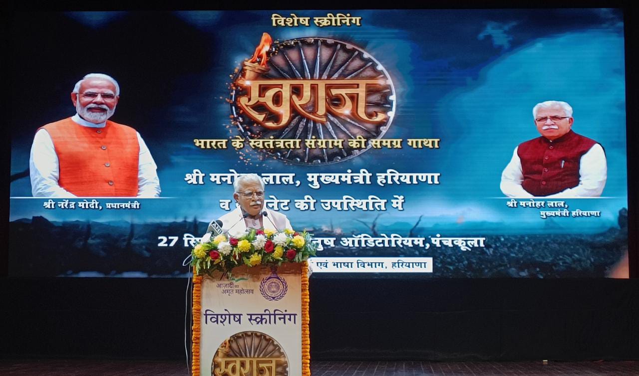 पंचकूला के इंद्रधनुष सभागार में आजादी के अमृत महोत्सव पर दूरदर्शन द्वारा आयोजित ‘स्वराज’ धारावाहिक की विशेष स्क्रीनिंग पर पहुंचे थे मुख्यमंत्री