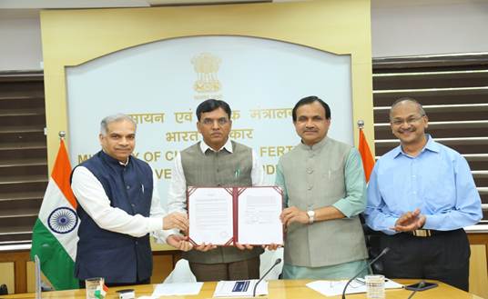 नई दिल्ली, 11अक्टूबर। केन्द्रीय रसायन और उर्वरक मंत्री, डॉ. मनसुख मांडविया को आज मैसर्स के प्लस एस मिडिल ईस्ट एफजेडई डीएमसीसी (के प्‍लस एस मिनरल्स एंड एग्रीकल्चर जीएमबीएच, जर्मनी की एक सहायक कंपनी) के साथ राष्ट्रीय रसायन और उर्वरक (आरसीएफ) द्वारा हस्ताक्षरित एक समझौता ज्ञापन सौंपा गया। समझौता ज्ञापन पर 6 अक्टूबर, 2022 को हस्ताक्षर किए गए थे। समझौता ज्ञापन का उद्देश्य कृषक समुदाय के लिए एमओपी की उपलब्धता में सुधार करना और विभिन्न ग्रेड के जटिल उर्वरकों के स्वदेशी उत्पादन को बढ़ावा देना है। इस अवसर पर केन्द्रीय रसायन एवं उर्वरक राज्य मंत्री भगवंत खुबा भी उपस्थित थे।