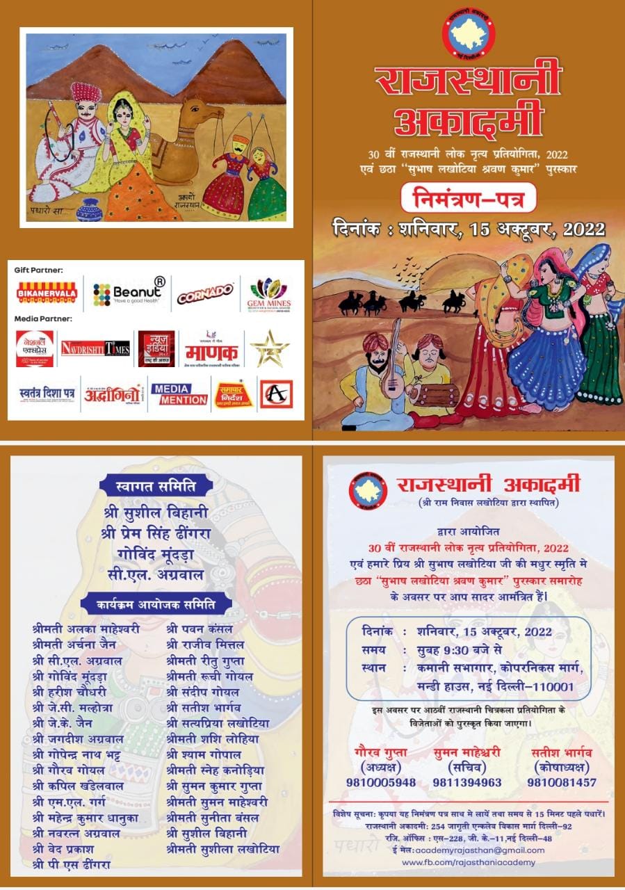 नई दिल्ली, 17अक्टूबर। राजस्थानी अकादमी ने शनिवार 15 अक्टूबर को कमानी ऑडिटोरियम कॉपरनिकस मार्ग नई दिल्ली में 30वीं राजस्थानी लोक नृत्य प्रतियोगिता और 8 वीं पेंटिंग प्रतियोगिता का सफलतापूर्वक आयोजन किया।