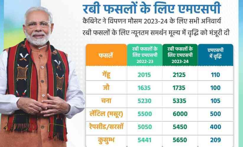 सरकार ने रबी फसलों के विपणन सीजन 2023-24 के लिए एमएसपी में वृद्धि की है, ताकि उत्पादकों को उनकी उपज के लिए लाभकारी मूल्य सुनिश्चित किया जा सके। मसूर के लिए 500/- रुपये प्रति क्विंटल और इसके बाद सफेद सरसों व सरसों के लिए 400/- रुपये प्रति क्विंटल एमएसपी में पूर्ण रूप से उच्चतम वृद्धि को मंजूरी दी गई है। कुसुंभ के लिए 209/- रुपये प्रति क्विंटल की वृद्धि को मंजूरी दी गई है। गेहूं, चना और जौ के लिए क्रमशः 110 रुपये प्रति क्विंटल और 100 रुपये प्रति क्विंटल की वृद्धि को मंजूरी दी गई है।