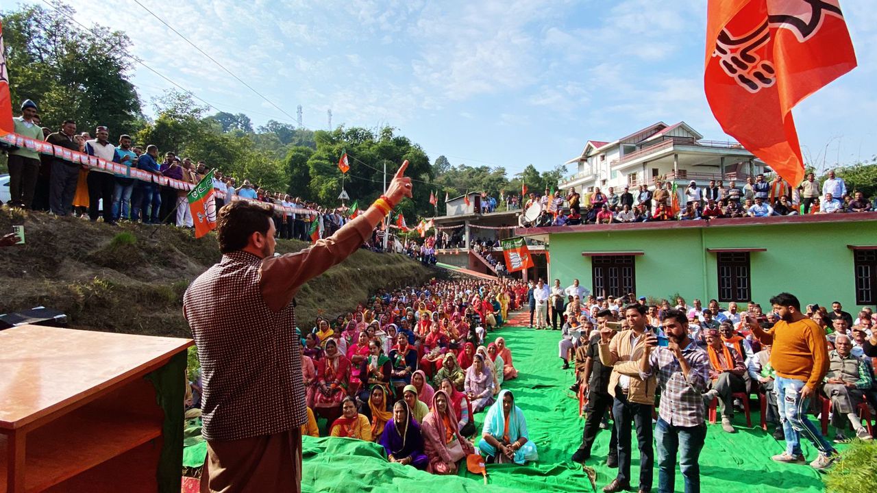 शिमला, 8 नवम्बर। हमीरपुर संसदीय क्षेत्र से लोकसभा सांसद व केंद्रीय सूचना प्रसारण एवं खेल व युवा कार्यक्रम मंत्री श्री अनुराग सिंह ठाकुर ने ज्वालामुखी विधानसभा में 3 व बड़सर विधानसभा में 8 जनसभाएँ कर युवाओं के लिए भाजपा सरकार द्वारा किए गये कार्यों का उल्लेख करते हुए प्रदेश भाजपा द्वारा जारी संकल्प पत्र में युवाओं को रोज़गार स्वरोज़गार उपलब्ध कराने के लिए किए गये संकल्पों पर प्रकाश डाला।