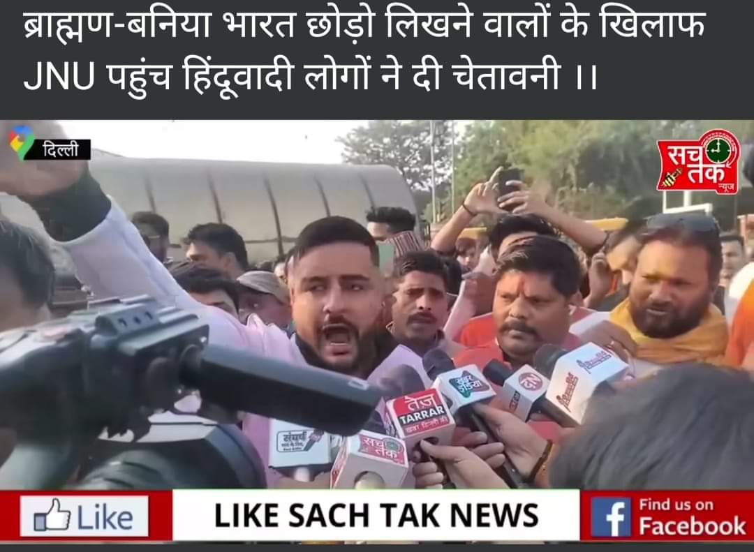 जेएनयू में ब्राह्मण – बनिया विरोधी नारों के विरोध में कल मुनिरका मेट्रो स्टेशन गेट नंबर 1से जेएनयू तक एक शांति मार्च का आयोजन किया गया था। (जो कि हमारे मौलिक अधिकारों की श्रेणी में आता है) जिसमें दिल्ली एनसीआर के सनातनी भाइयों और बहनों ने बढ़ चढ़कर हिस्सा लिया किंतु, हमें जेएनयू में प्रवेश नहीं करने दिया गया। सभी साथियों को गिरफ्तार करके सरोजिनी नगर पुलिस स्टेशन कुछ को वसंत कुंज पुलिस स्टेशन ले जाया गया, जिससे हम अपना विरोध प्रदर्शन करने और मार्च निकालने में असफल रहे किंतु, हर्ष और संतुष्टि का विषय यह है कि इसके बावजूद कुछ साथी बहन निधि गुप्ता जी के साथ जेएनयू में अंदर घुसने में सफल रहे और उन्होंने लगभग 1 किलोमीटर लंबा मार्च भी निकाला,