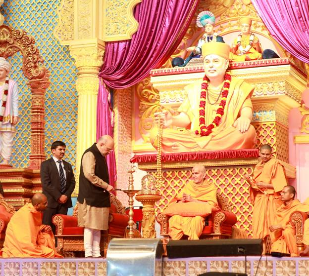 केंद्रीय गृह मंत्री ने कहा कि सन्यासी का समाज में योगदान मानवों को शांति, सद्मार्ग और सदउद्देश्य देना होता है जिसे प्रमुख स्वामी महाराज ने बिना बोले जीवन पर्यंत करके दिखाया। प्रमुख स्वामी महाराज ने अपने जीवन में 1100 से ज्यादा सन्यासियों की टुकडी तैयार की, हजारों मंदिर बनवाए, अनेक सत्संग सभाएं कीं और घर-घर जाकर लोगों के दुख-दर्द सुने। उन्होंने घरसभा के माध्यम से परिवारों में कुटुंब की भावना को मजबूत कर फिर से कुटुंब नाम की संस्था को जीवित करने का काम किया जिसका बना रहना ही भारतीय संस्कृति के अस्तित्व का द्योतक है।उन्होंने कहा किप्रमुख स्वामी महाराज द्वारा बनाई गयी नगरी देश और दुनियाभर के मेनेजमेन्ट के विद्यार्थियों के लिए एक सक्सेस स्टोरी प्रोजेक्ट जैसा है।लोग इस नगरी में आकर प्रमुख स्वामी महाराज के जीवन के संदेश,वेद,उपनिषद् और सांस्कृतिक बोधकथाओं को समझेंगे।