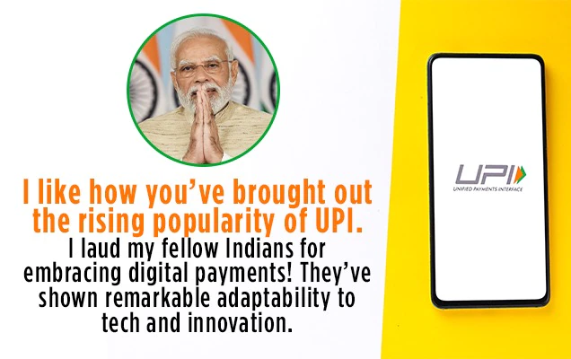 “जिस तरह से आप लोगों ने यूपीआई की लोकप्रियता बढ़ाई है, वह मुझे अच्छा लगा। मैं डिजिटल भुगतान को अपनाने के लिए अपने देशवासियों की सराहना करता हूं! उन्होंने तकनीक और नवाचार के प्रति उल्लेखनीय अनुकूलता दिखाई है।