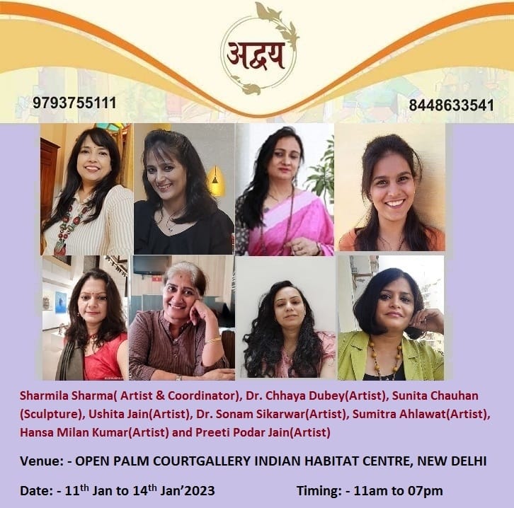नई दिल्ली, 11जनवरी। शर्मीला शर्मा द्वारा “अद्वय” group show 11 से 14 जनवरी 2023 को इंडियन हैबिटैट सेंटर ओपन पाम कोर्ट लोधी रोड नई दिल्ली में आयोजित किया जा रहा है। जिसका समय सुबह 11 बजे से शाम 7 बजे तक है | जिसमे अलग अलग प्रदेशों से कलाकार भाग ले रहे है भोपाल के चार कलाकार Dr. छाया दुबे , हंसा मिलन , प्रीति पोदार जैन और Dr.सोनम सिकरवार सभी अपने medium के अनुसार आर्ट वर्क करते है | Ushita जैन मुंबई से है जो की प्रिंट मेकिंग में ज्यातातर काम करती है | तीन आर्टिस्ट दिल्ली शर्मीला शर्मा , सुमित्रा अहलावत सभी medium में अपना आर्ट वर्क करती है और सुनीता चौहान एक मूर्तिकला की आर्टिस्ट है |