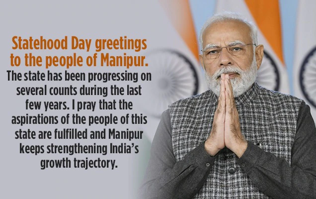 “मणिपुर वासियों को राज्य स्थापना-दिवस पर बधाई। विगत कई वर्षों के दौरान राज्य अनेक क्षेत्रों में प्रगति कर रहा है। मैं प्रार्थना करता हूं कि राज्य के लोगों की आकांक्षायें पूर्ण हों और मणिपुर, भारत के विकास-पथ को मजबूत बनाता रहे।”