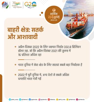 आर्थिक सर्वेक्षण इस बारे में प्रकाश डालता है कि वित्त वर्ष 2023 (दिसम्बर 2022 तक) के दौरान भारत ने वित्त वर्ष 2022 में निर्यात के रिकॉर्ड स्तर के बाद लचीलेपन का प्रदर्शन किया है। पेट्रोलियम उत्पाद, जवाहरात और आभूषण, जैविक और कार्बनिक, रसायन, दवाइयां और औषधियां, प्रमुख निर्यात वस्तुओं में शामिल रहे। हालोंकि वैश्विक बाजार में मंदी की विशेषता वाली धीमी वैश्विक अर्थव्यवस्था में भारतीय निर्यात में मंदी अपरिहार्य रही। यह सर्वेक्षण बताता है कि विदेशी क्षेत्र के लचीलेपन को बेहतर बनाने के लिए निर्यात की प्रमुख भूमिका को स्वीकार करते हुए मध्यम से दीर्घकालिक परिदृश्य तक महत्वपूर्ण भूमिका निभाते हैं और विभिन्न निर्यात प्रोत्साहन उपाय पर विचार/कार्यान्वयन किया जा रहा है। ये उपाय भारतीय निर्यात में व्याप्त अंतर्निहित तुलनात्मक लाभों को पोषित करेंगे और भारतीय निर्यात में समाविष्ट रहेंगे।