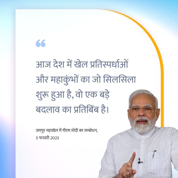 प्रधानमंत्री ने कहा कि भारत के युवाओं में खेलों के लिए जुनून और प्रतिभा की कमी नहीं थी, लेकिन संसाधनों की अनुपलब्धता और सरकार से समर्थन की कमी के कारण बाधाएं उपस्थित हुई थी। उन्होंने जोर देकर कहा कि एथलीटों के सामने आने वाली इन समस्याओं का आज समाधान किया जा रहा है। प्रधानमंत्री ने पिछले 5-6 वर्षों से आयोजित होने वाले जयपुर महाखेल का उदाहरण देते हुए कहा कि देश के कोने-कोने में खेल महाकुंभ का आयोजन भाजपा के सांसदों द्वारा किया जा रहा है, जहां हजारों युवाओं की प्रतिभा उभर कर सामने आ रही है।