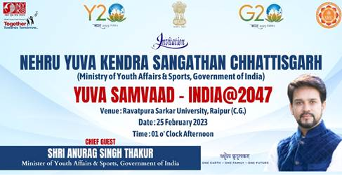 नई दिल्ली, 25 फरवारी। नेहरू युवा केंद्र संगठन छत्तीसगढ़ (युवा कार्यक्रम खेल मंत्रालय , भारत सरकार) द्वारा युवा संवाद तथा Y20 कार्यक्रम का आयोजन रावतपूरा सरकार विश्वविद्यालय , रायपुर में दिनांक 25 फरवरी 2023 को युवा कार्यक्रम एवं खेल मंत्री , भारत सरकार अनुराग ठाकुर जी के मुख्य आतिथ्य और रायपुर सांसद सुनील सोनी , पद्मश्री अजय मंडवी, पद्मश्री फूलबासन बाई के विशिष्ट आथित्य में होगा ।