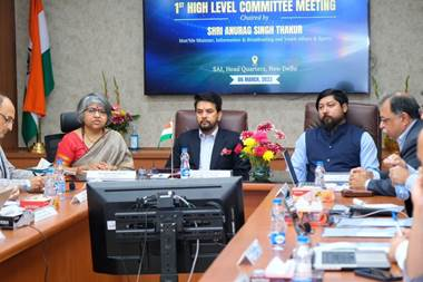 नई दिल्ली, 7 मार्च।केंद्रीय सूचना एवं प्रसारण तथा युवा कार्यक्रम एवं खेल मंत्री अनुराग सिंह ठाकुर ने युवा कार्यक्रम एवं खेल राज्य मंत्री (एमओएस) निशिथ प्रामाणिक के साथ सोमवार, 6 मार्च को पेरिस ओलंपिक 2024 के लिए उच्च स्तरीय समिति की पहली बैठक की अध्यक्षता की।