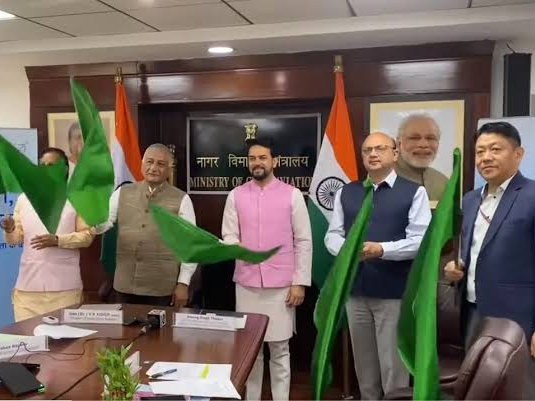 केन्द्रीय मंत्री अनुराग ठाकुर, केन्द्रीय मंत्री ज्योतिरादित्य सिंधिया और केन्द्रीय राज्यमंत्री जनरल वी.के. सिंह ने इंडिगो की दिल्ली-धर्मशाला-दिल्ली की प्रथम उड़ान को झंडी दिखाई