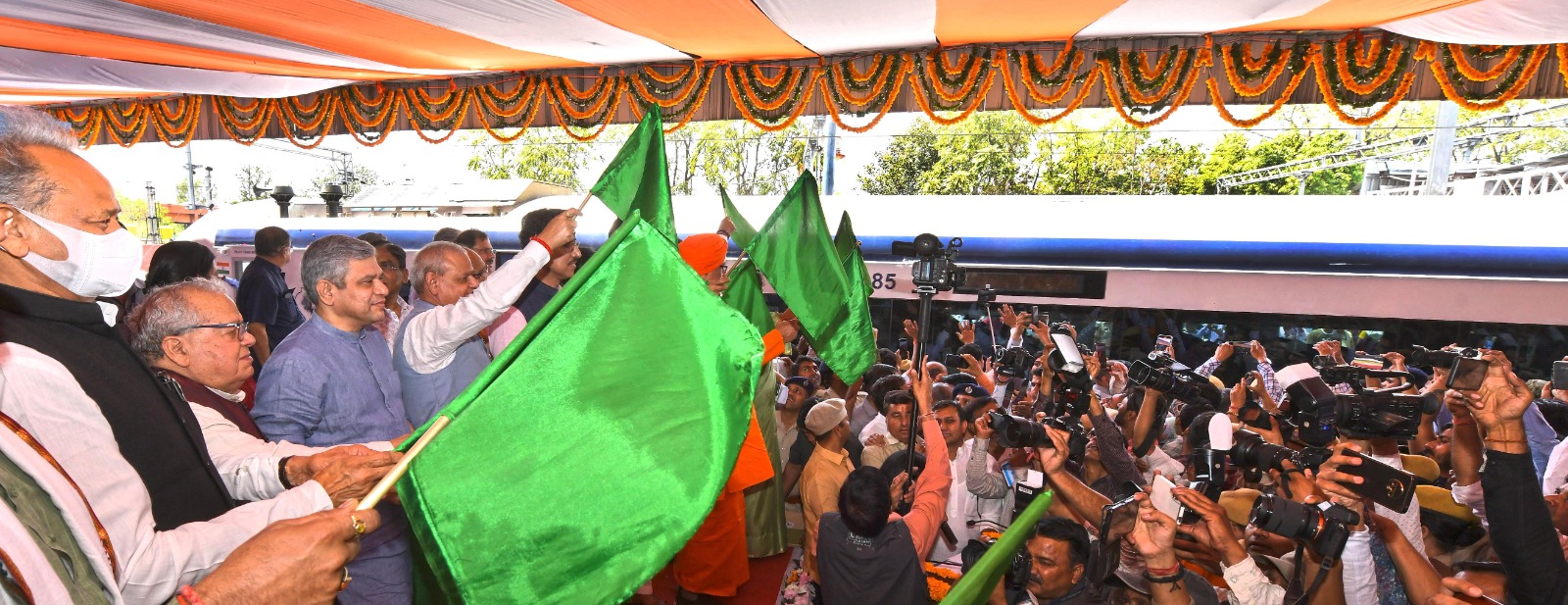 नई दिल्ली/जयपुर, 12 अप्रैल। प्रधानमंत्री नरेन्द्र मोदी द्वारा वीडियो कॉन्फ्रेंसिंग के जरिए जयपुर से नई दिल्ली के लिए वंदे भारत एक्सप्रेस ट्रेन को हरी झण्डी दिखाकर रवाना करने के अवसर पर जयपुर जंक्शन पर आयोजित समारोह में राज्यपाल श्री कलराज मिश्र सम्मिलित हुए। जयपुर जंक्शन से वंदे भारत एक्सप्रेस को राज्यपाल श्री कलराज मिश्र, मुख्यमंत्री श्री अशोक गहलोत, रेल मंत्री श्री अश्विनी वैष्णव ने हरी झण्डी दिखाई। इस अवसर पर सांसद, विधायक सहित जनप्रतिनिधिगण एवं अधिकारीगण उपस्थित रहे।
