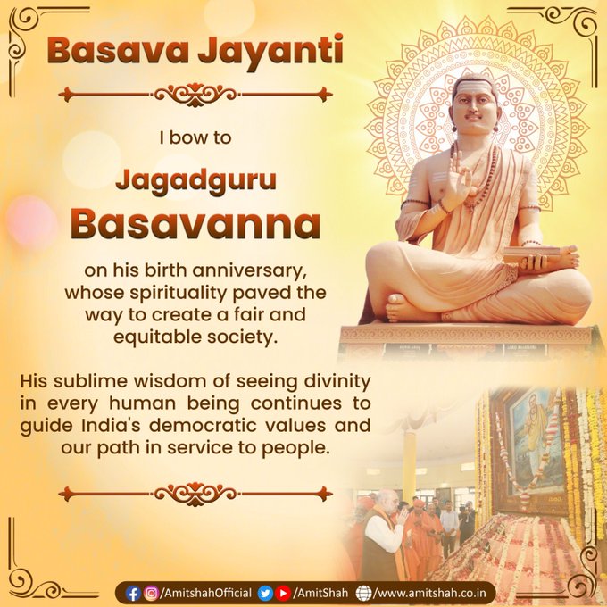 एक ट्वीट में अमित शाह ने कहा कि “जगद्गुरू बसवन्ना की आध्यात्मिकता ने एक निष्पक्ष और न्यायसंगत समाज के निर्माण का मार्ग प्रशस्त किया। हर इंसान में देवत्व देखने की उनकी उत्कृष्ट बुद्धि भारत के लोकतांत्रिक मूल्यों और लोगों की सेवा करने कि दिशा में हमारा मार्गदर्शन करती है।”