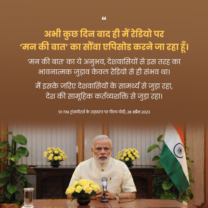 प्रधानमंत्री ने रेडियो के साथ उनकी पीढ़ी के भावनात्मक लगाव को रेखांकित किया। मन की बात के आगामी 100वें एपिसोड का जिक्र करते हुए प्रधानमंत्री ने कहा, “मेरे लिए, एक अतिरिक्त खुशी की बात यह है कि एक होस्ट के रूप में रेडियो के साथ भी मेरा रिश्ता है।” उन्होंने कहा, “देशवासियों से इस तरह का भावनात्मक जुड़ाव, रेडियो के माध्यम से ही संभव था। इसके माध्यम से मैं देश की ताकत और देशवासियों के बीच कर्तव्य की सामूहिक शक्ति से जुड़ा रहा।“ उन्होंने स्वच्छ भारत, बेटी बचाओ बेटी पढाओ और हर घर तिरंगा जैसी पहलों की भूमिका का उदाहरण देते हुए कहा कि मन की बात के माध्यम से ये प्रयास जन आंदोलन बन गए। प्रधानमंत्री ने कहा, “इसलिए, एक तरह से, मैं आपके आकाशवाणी परिवार का हिस्सा हूं।“