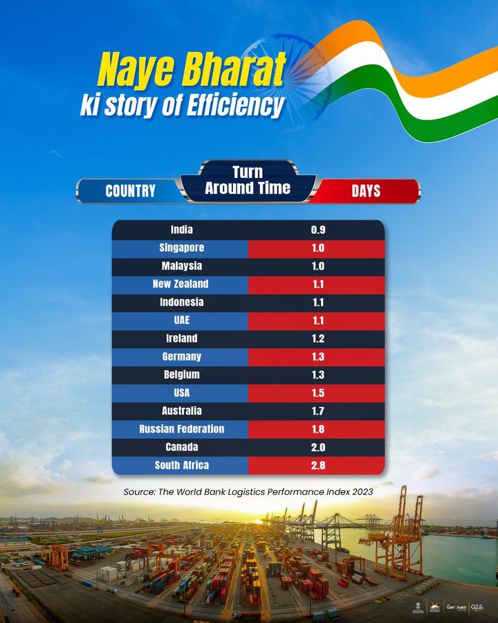 नई दिल्ली, 02मई। पत्तन,पोत परिवहन और जलमार्ग मंत्रालय ने विश्व बैंक की एलपीआई 2023 रिपोर्ट के अनुसार कई देशों की तुलना में बेहतर “टर्न अराउंड टाइम” के साथ भारतीय बंदरगाहों की दक्षता और उत्पादकता में वृद्धि होने के बारे में ट्वीट किया है।