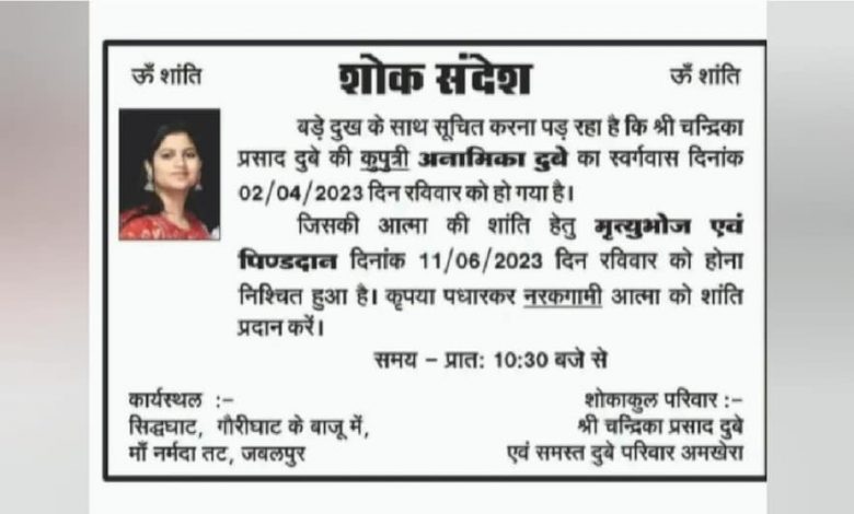 दरअसल, जबलपुर के अमखेरा इलाके में रहने वाली अनामिका दुबे ने मोहम्मद अयाज नाम के गैर धर्म के युवक के साथ निकाह कर लिया था. शादी के बाद वह अनामिका दुबे से उजमा फातिमा बन गई थी. बेटी के इस फैसले से नाराज होकर परिवार ने बेटी का परित्याग करते हुए, उसके निधन का शोक संदेश का कार्ड भी छपवाया, जिसे अपने परिचितों और रिश्तेदारों को भी भेजा और नर्मदा तट पर आयोजित पिंडदान संस्कार में शामिल होने का न्योता दिया.