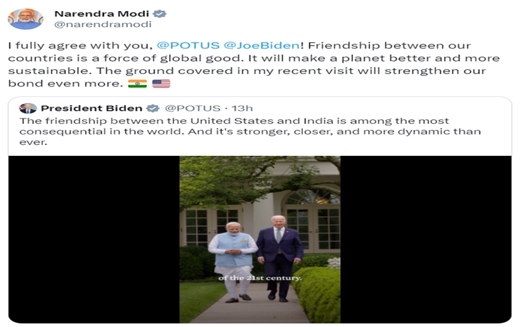 नई दिल्ली, 26जून।प्रधानमंत्री नरेन्द्र मोदी ने कहा है कि भारत और अमरीका की मित्रता वैश्विक कल्याण के लिए एक शक्ति है। इससे पृथ्वी और बेहतर तथा सुस्थिर बनेगी। अमरीकी राष्ट्रपति जो बाइडेन के एक ट्वीट के जवाब में मोदी ने कहा कि उनकी अमरीका यात्रा के दौरान हुई प्रगति इस संबंध को और प्रगाढ़ बनाएगी। राष्ट्रपति बाइडेन ने अपने ट्वीट में कहा कि दोनों देशों के बीच की मित्रता विश्व के लिए बहुत ही महत्वपूर्ण है। उन्होंने कहा कि यह पहले की तुलना में अधिक मजबूत और गतिशील है।