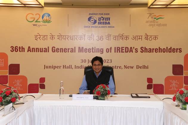 नई दिल्ली, 02जुलाई। भारतीय नवीकरणीय ऊर्जा विकास एजेंसी लिमिटेड (आईआरईडीए) ने 30 जून, 2023 को नई दिल्ली में इंडिया हैबिटेट सेंटर में अपनी 36वीं वार्षिक आम बैठक (एजीएम) आयोजित की। बैठक में वित्त वर्ष 2022-23 के लिए वार्षिक खातों को अपनाया गया, जिसमें उल्लेखनीय उपलब्धियों को प्रदर्शित किया गया।