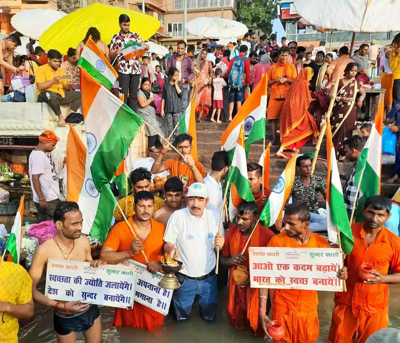 वाराणसी में सावन के प्रथम सोमवार से पूर्व गंगा तट पर कांवड़ियों को नमामि गंगे की ओर से गंगा जल संरक्षण का संकल्प दिलाया गया