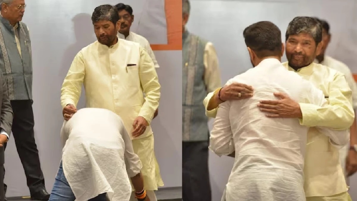 बैठक के दौरान सांसद चिराग पासवान ने अपने चाचा और केंद्रीय मंत्री पशुपति पारस के पैर छुए. इस पर पशुपति पारस ने भतीजे चिराग पासवान को गले लगा लिया.