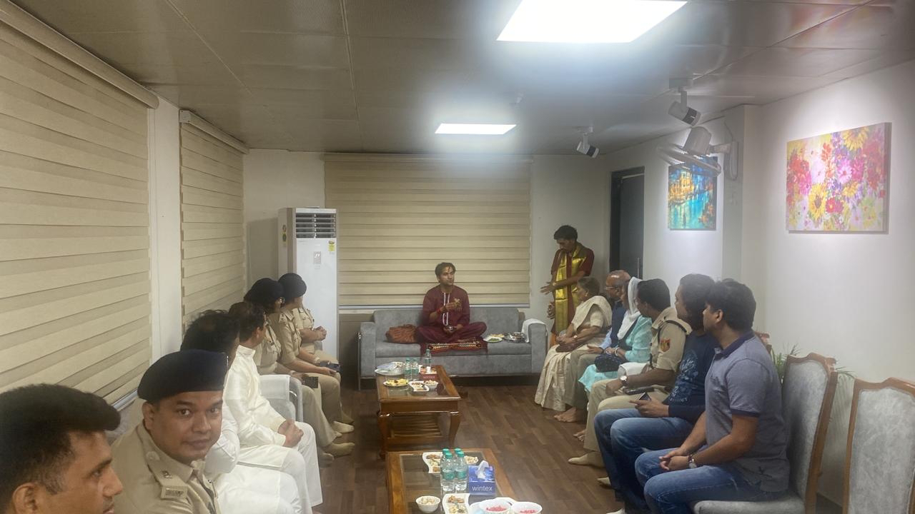 डीसीपी के दफ़्तर में धीरेंद्र शास्त्री का दरबार लगा। दरबार में सोफे पर पालथी मारे धीरेंद्र शास्त्री बैठे।