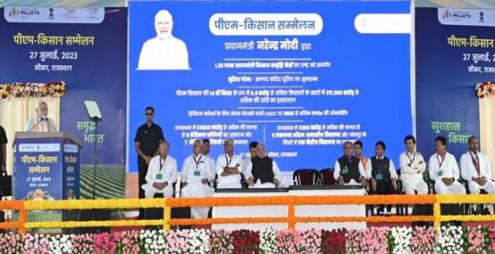 प्रधानमंत्री मोदी ने पीएम किसान सम्मान निधि का जिक्र करते हुए कहा कि यह दुनिया की सबसे बड़ी योजना है जिसमें सीधे किसानों के बैंक खाते में धनराशि ट्रांसफर की जाती है। आज की 14वीं किस्त को मिला लें तो अब तक 2.60 लाख करोड़ रुपये से ज्यादा सीधे किसानों के बैंक खातों में ट्रांसफर किए जा चुके हैं जिससे किसानों को विभिन्न खर्चों को कवर करने में फायदा हुआ है। उन्होंने कहा कि किसानों का सामर्थ्य, किसानों का परिश्रम, मिट्टी से भी सोना निकाल देता है इसलिए सरकार किसानों के साथ कंधे से कंधा मिलाकर खड़ी है। हमारी सरकार कैसे अपने किसान भाइयों के पैसे बचा रही है, इसका एक उदाहरण यूरिया की कीमतें भी हैं। हमारी सरकार ने कोरोना और रूस-यूक्रेन युद्ध का असर किसानों पर नहीं पड़ने दिया। आज देश में यूरिया की जो बोरी 266 रु. में देते हैं, यहीं बोरी पाकिस्तान में करीब 800 रु. में मिलती है, बांग्लादेश में 720 रु. और चीन में 2100 रु. की मिलती है। अमेरिका में यूरिया की यही बोरी 3000 रु. से ज्यादा की मिल रही है। प्रधानमंत्री मोदी ने कहा कि सरकार किसानों को यूरिया की कीमतों से परेशान नहीं होने देगी, जब कोई किसान यूरिया खरीदने जाता है तो उसे विश्वास होता है कि यह मोदी की गारंटी है। प्रधानमंत्री ने श्री अन्न को बढ़ावा देने हेतु उठाए कदमों का जिक्र करते हुए कहा कि इससे श्री अन्न के उत्पादन, प्रसंस्करण, निर्यात में वृद्धि हो रही है।