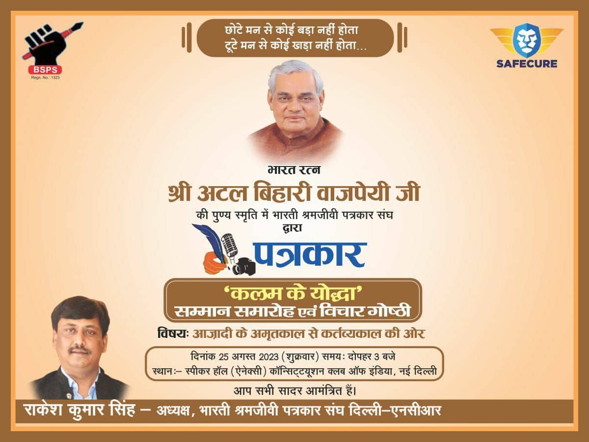 नई दिल्ली, 25 अगस्त। ‘भारती श्रमजीवी पत्रकार संघ’ आज शुक्रवार (25 अगस्त, 2023) को पूर्व प्रधानमंत्री और भारत रत्न से सम्मानित अटल बिहारी बाजपेयी को श्रद्धांजलि अर्पित करने के लिए नई दिल्ली में ‘कलाम के योद्धा’ सम्मान समारोह और विचार गोष्ठी का आयोजन करने जा रहा है। जिसका विषय ‘स्वतंत्रता के समय से कर्तव्य के समय तक’ रखा गया है।