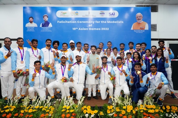 निशानेबाजी, रोइंग और महिला क्रिकेट टीमों के कुल 27 एथलीटों का खेल मंत्री श्री अनुराग सिंह ठाकुर द्वारा अभिनंदन किया गया। हरमनप्रीत कौर के नेतृत्व में महिला क्रिकेट टीम ने एशियन गेम्स में ऐतिहासिक स्वर्ण पदक जीता, जबकि रोइंग में कुल 5 पदक (2 रजत, 3 कांस्य) प्राप्त हुए। अब तक अधिकांश पदक निशानेबाजी से आए हैं जिसमें हमारी राइफल, शॉटगन और पिस्टल टीमों ने 13 पदक (4 स्वर्ण, 4 रजत और 5 कांस्य) जीते हैं।